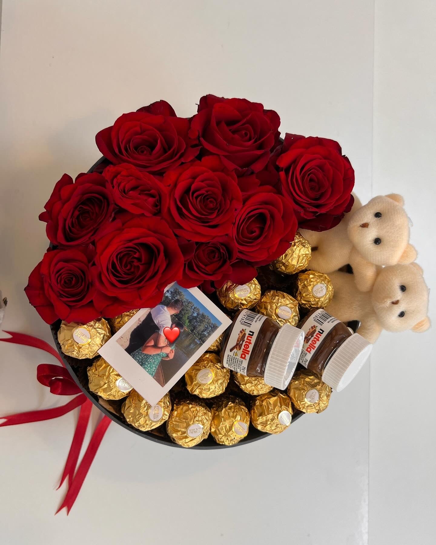 Rosenbox mit Rocher, 2 Bärchen, 2 mini Nutella und ein personalisiertes Foto